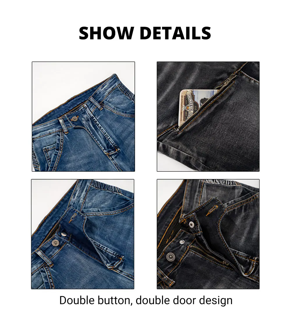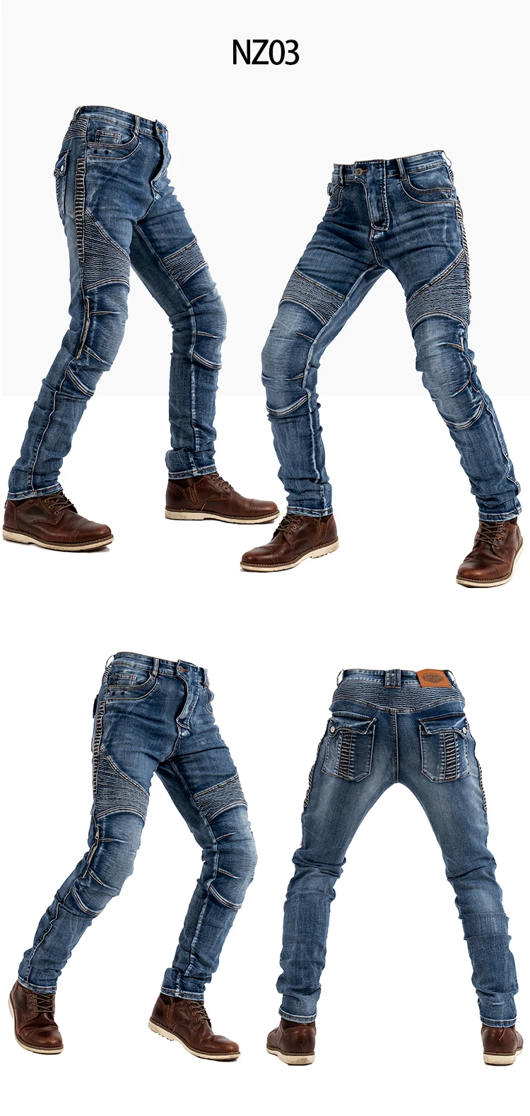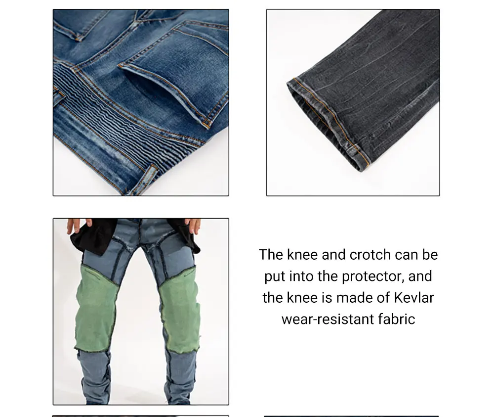 Brand new motorcycle jeans, the pursuit of the original denim style, the fabric is thick, the sewing is firm, the tear strength is high, and it has a good washing effect. It is one of the high-end denim fabrics.