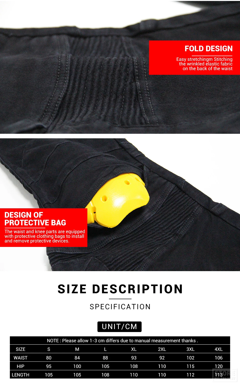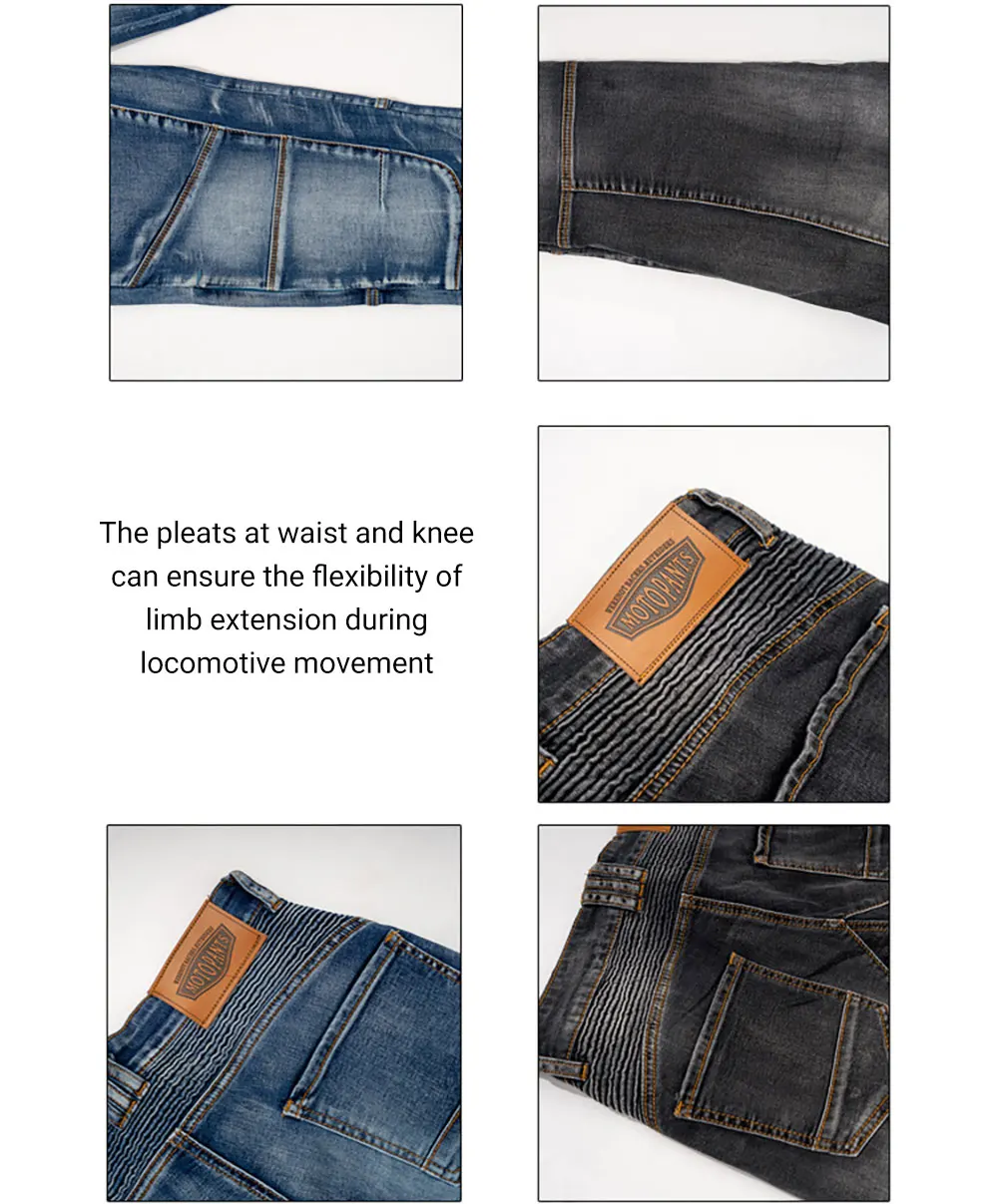 The front knee and back waist are folded for freedom of movement and comfort while riding the motorcycle.